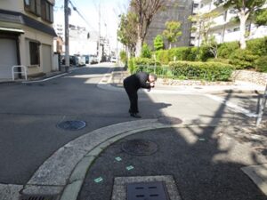 令和3年4月に神戸市内の住宅地交差点で出会い頭衝突が発生した。この事故では双方の車両が衝突する直前の速度を解明するために令和8年4月16日に現場を調査した。一車両のドライブレコーダー画像と建物の防犯カメラ画像に衝突状態が残されていたことから、道路での基点間を計測して速度を求める。