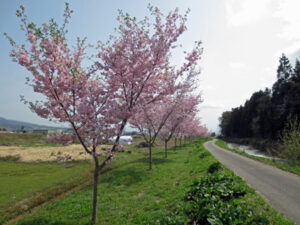 さくらが満開 2025年4月20日 綾田成樹 今年も地域の桜が満開となった。この桜はアーコレード種であり、春と秋に咲く有名な桜である。このように秋にも咲く桜を6種類で160本植えている。桜植樹地の草払いなど管理が大変であるが、このような桜を見ると応えたいと思う次第である。